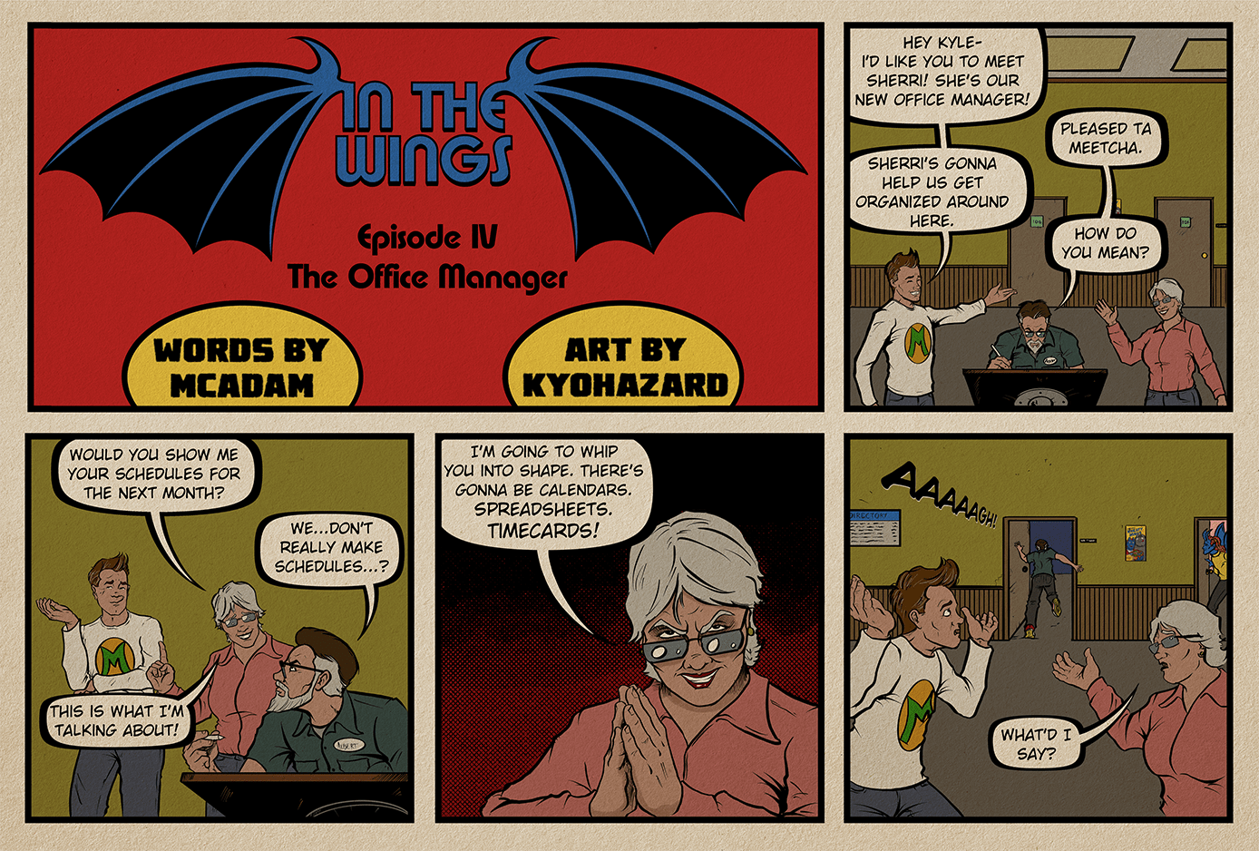 PANEL TWO: SHERRI kindly asks for the schedules. KYLE and MICHAEL look confused.