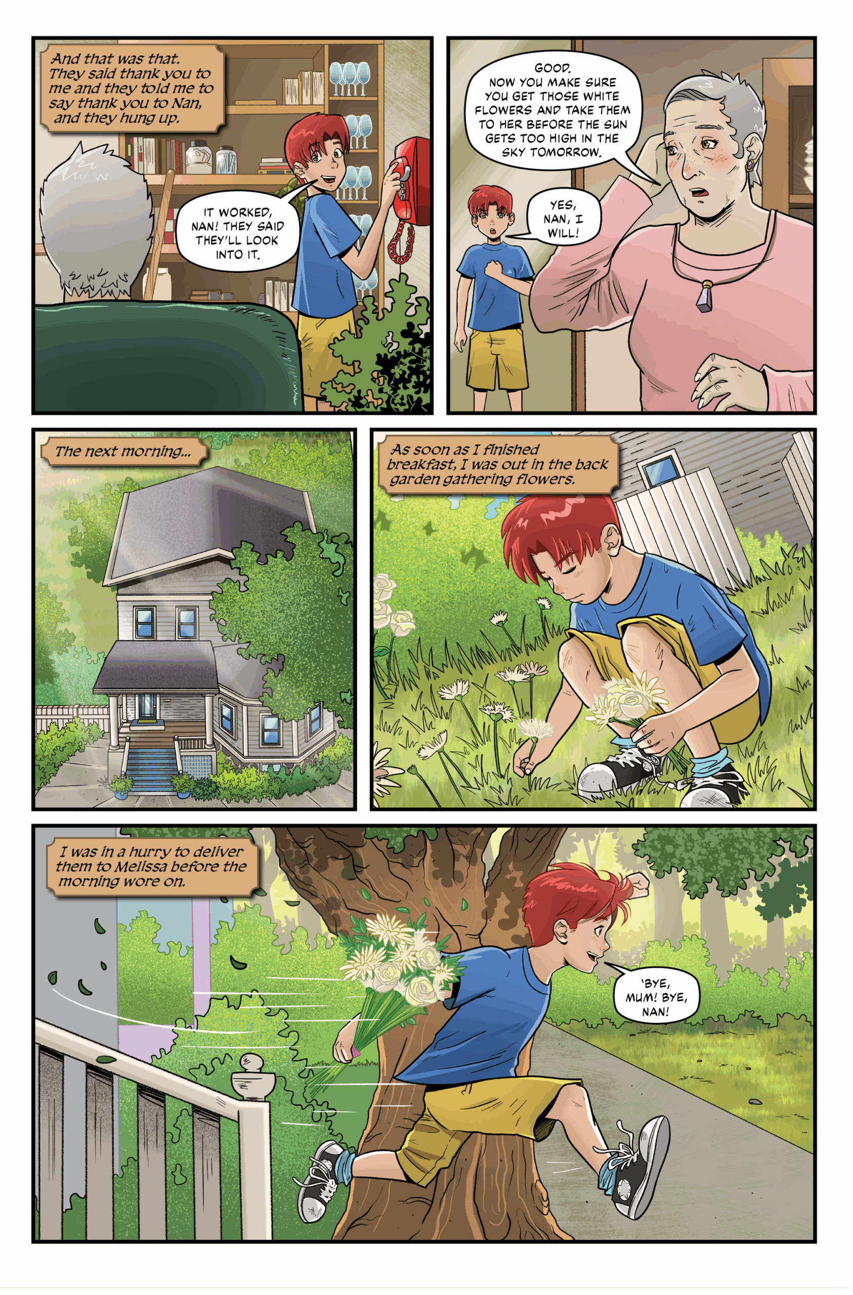PANEL FOUR: DYLAN is in the back garden, picking some white flowers into a small bouquet.